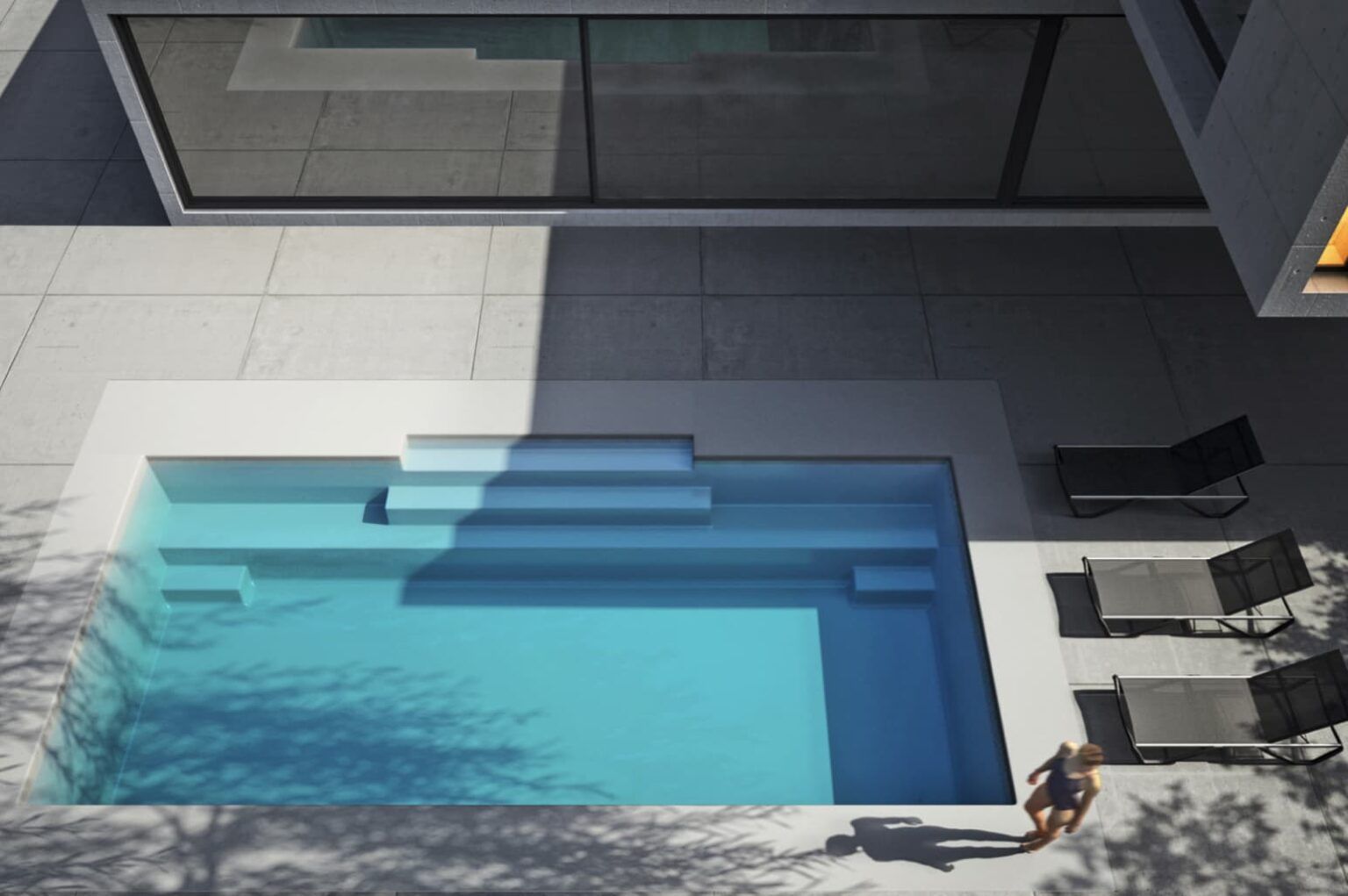 Elgancia y funcionalidad. Este modelo se distingue por su diseño rectangular con escalera integrada en un extremo, optimizando el espacio para el baño y el juego. Su construcción en poliéster de alta resistencia garantiza durabilidad y un mantenimiento sencillo. Ideal para jardines modernos.